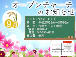 9月のオープンチャーチ! 明日、9月28日(日)は月に一度のオープンチャーチの日です! みんなで楽しい時間を過ごしたいと思っていますので、ぜひ教会にお越しください! 共有:Tweet By Yuuki | 2025年9月27日 | 教会学校 | No Comments | ← 秋学期ゴスペルレッスンのご案内 コメントを残す コメントをキャンセルメールアドレスが公開されることはありません。 * が付いている欄は必須項目ですコメント * 名前 * メール * サイト 次回のコメントで使用するためブラウザーに自分の名前、メールアドレス、サイトを保存する。 新しいコメントをメールで通知 新しい投稿をメールで受け取る Δ