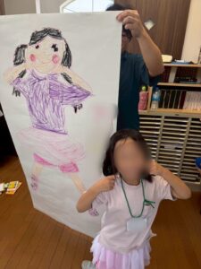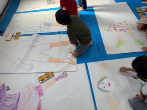 みことばから僕たちが神様から大切に造られたことを聞き、大切に造られた自分がどんな姿をしているのか、大きな模造紙にそれぞれ等身大の自分の絵を描きました。